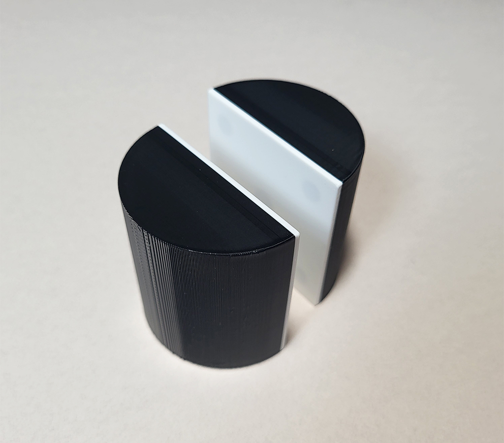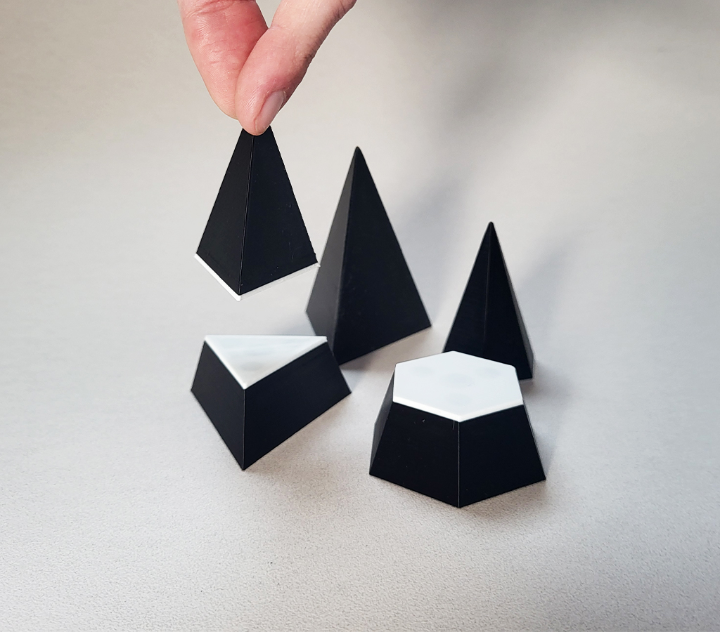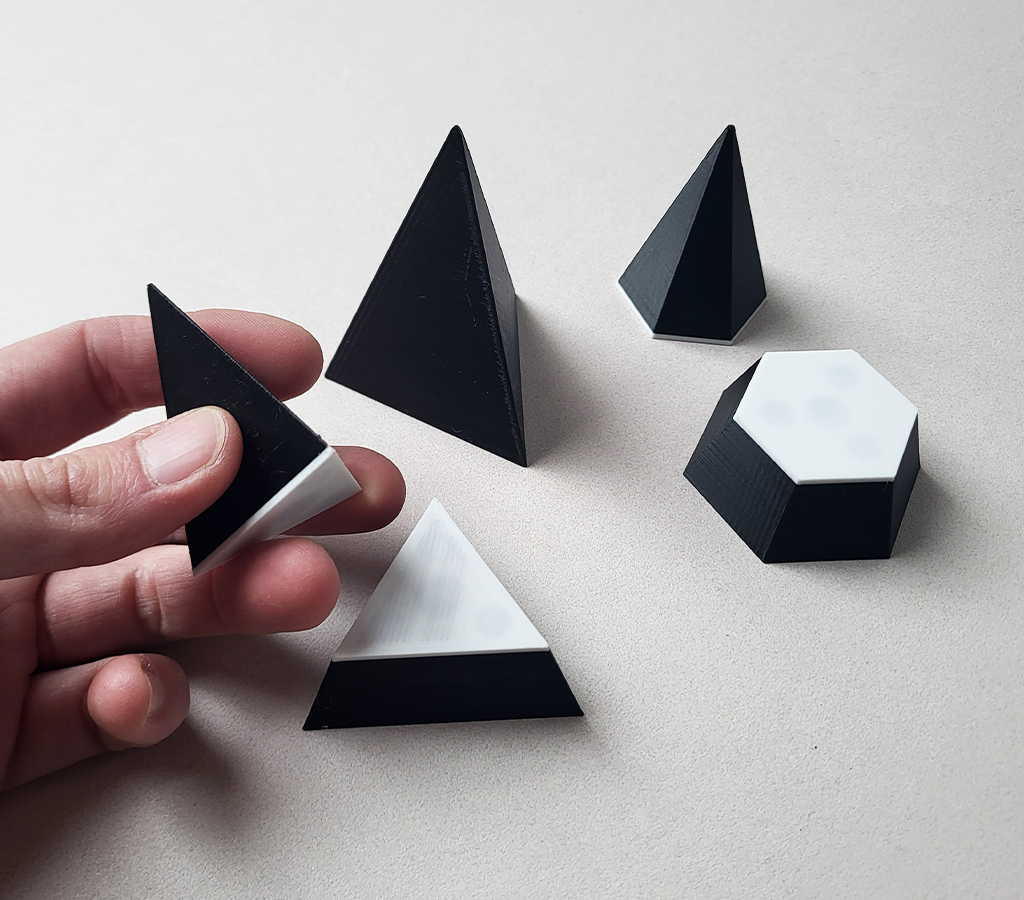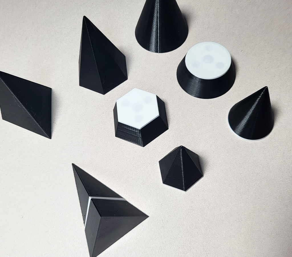 Le coffret « solides coupés » comprend 19 solides coupés en noirs et blancs et réalisés en impression 3D. Ils sont aimantés au niveau de la coupe. Deux textures différentes (une pour la partie noire, la seconde pour la partie blanche représentant les sections) permettent une reconnaissance tactile des éléments.
